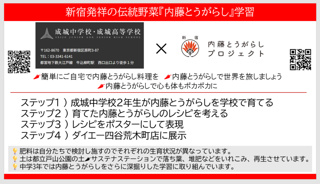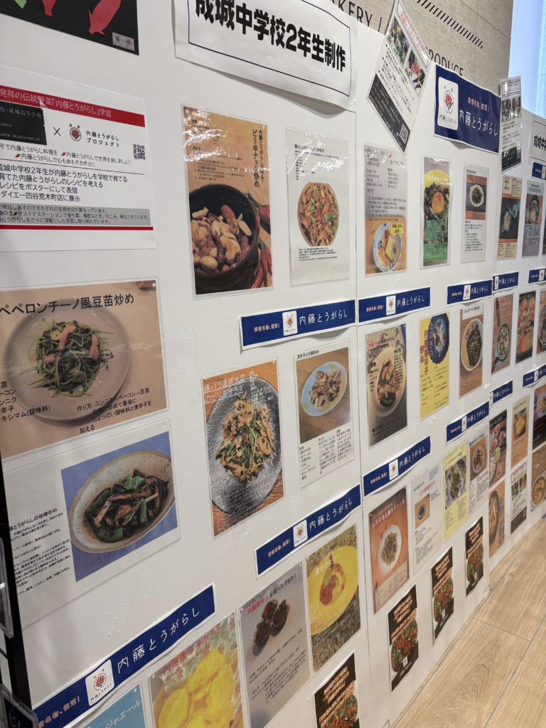 2025.12 ダイエー四谷荒木町店ご協力のもと、成城中学2年の学生が内藤とうがらしのレシピを考え、ポスターにしたものを店内に展示中。
